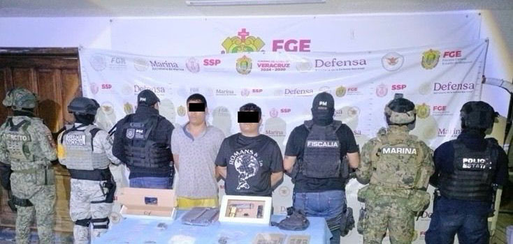 Durante la implementación de cateos en apoyo a la Fiscalía General del Estado (FGE), fueron detenidas dos personas, asegurándoseles un arma de fuego corta, cargadores y cartuchos útiles; 28 dosis y una bolsa con sustancia con características del cristal; además de un camión, un semirremolque, un tractocamión, una caja seca y un contenedor.